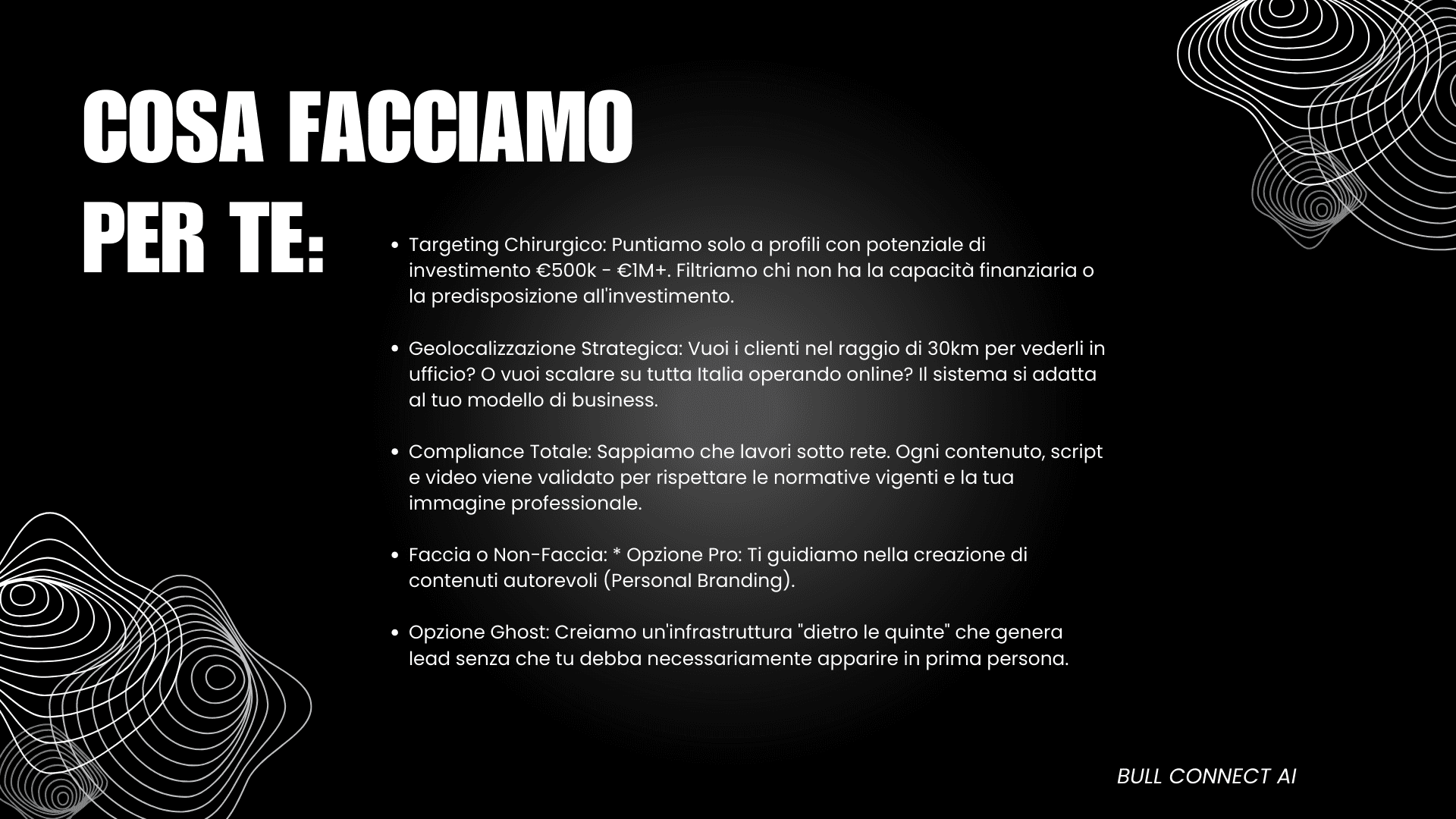 Niente chiamate a freddo. L'ecosistema educa il prospect 24/7 in background sui tuoi servizi e sul tuo posizionamento, filtrando automaticamente chi non ha la capacità di investimento adatta.